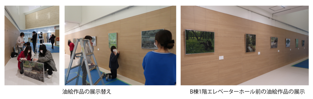 B棟1階エレベーターホール前、および予防医学センターに展示していた油絵作品の展示替えを行いました。