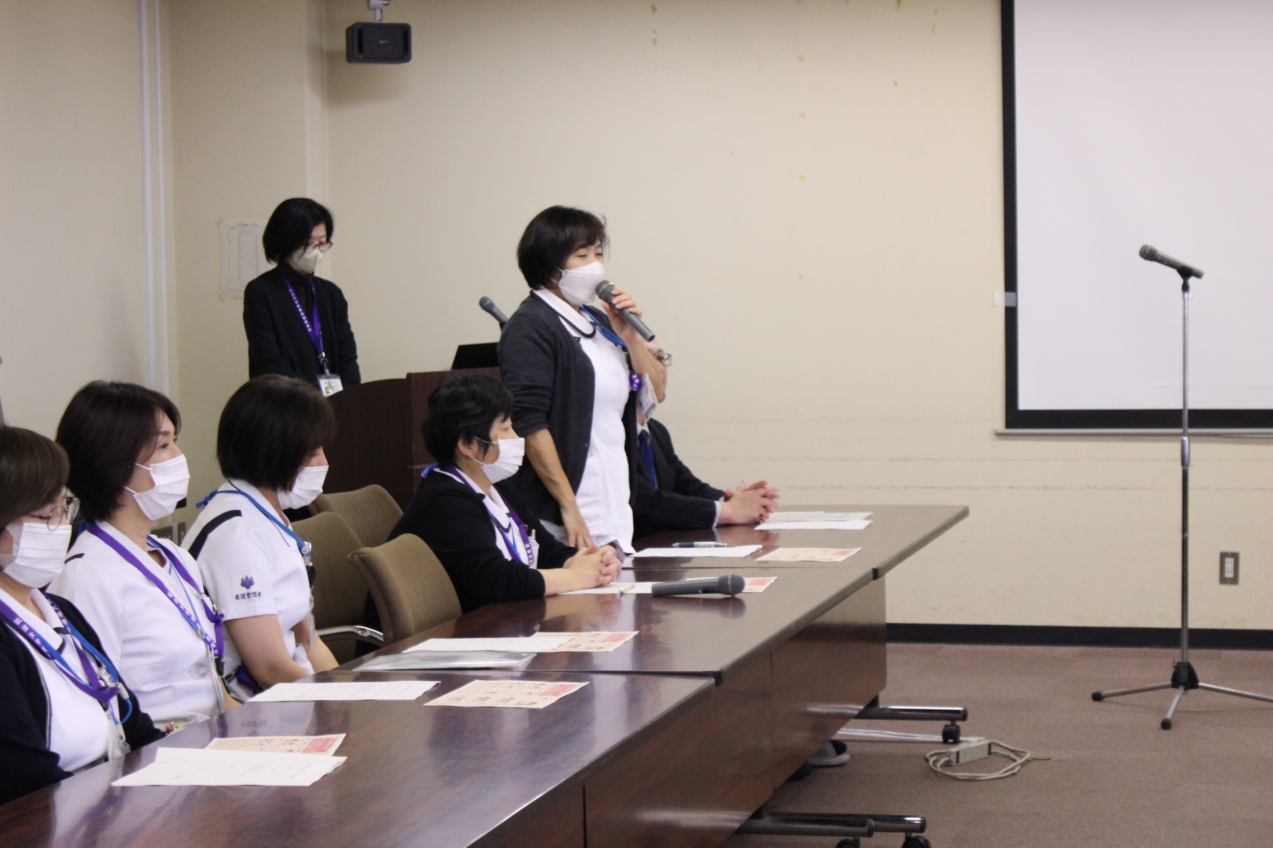挨拶される川崎宏病院総務部長 挨拶される篠崎まゆみ看護部長