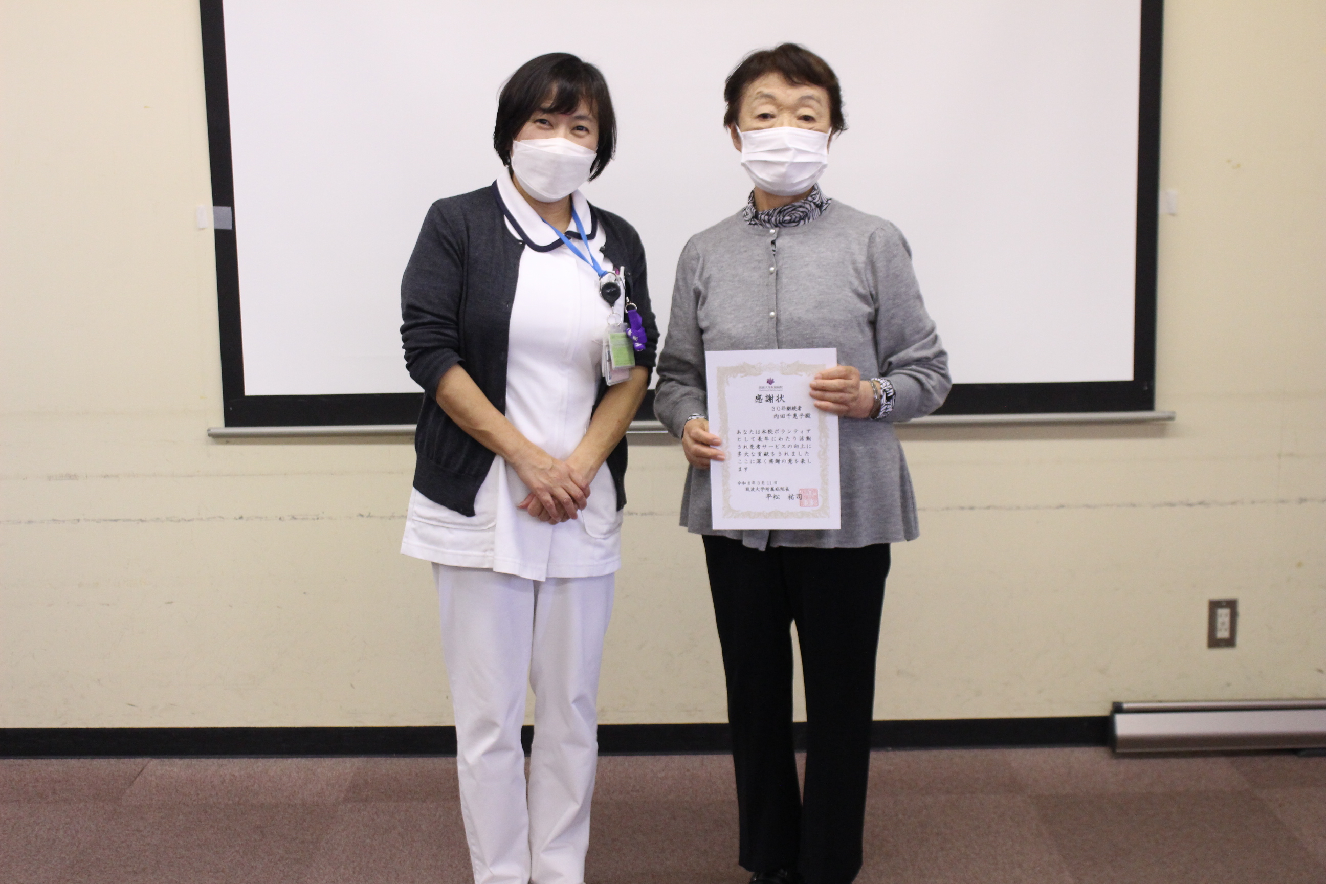 3月11日(水)附属病院において,ボランティア懇談会が開催されました。はじめに川﨑 宏副病院長(財務担当)、篠崎まゆみ副病院長(看護・患者サービス担当)から挨拶があり,続いて,ボランティア活動長期活動継続表彰がおこなわれました。今年度は、30年継続者1名、10年継続者3名に感謝状の贈呈がおこなれました。その後、歯科衛生士の荒川知恵氏による「知っていますか?オーラルフレイル」を講演いただきました。ボランティアの皆さんが熱心に聴講されていました。