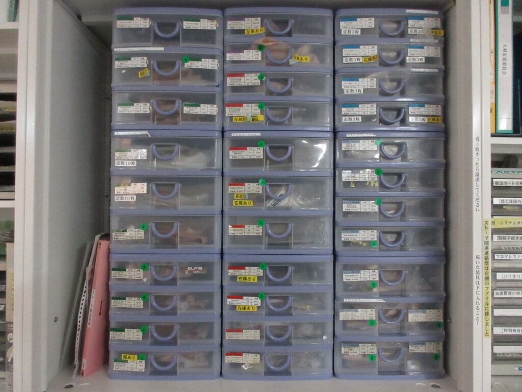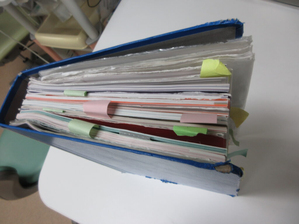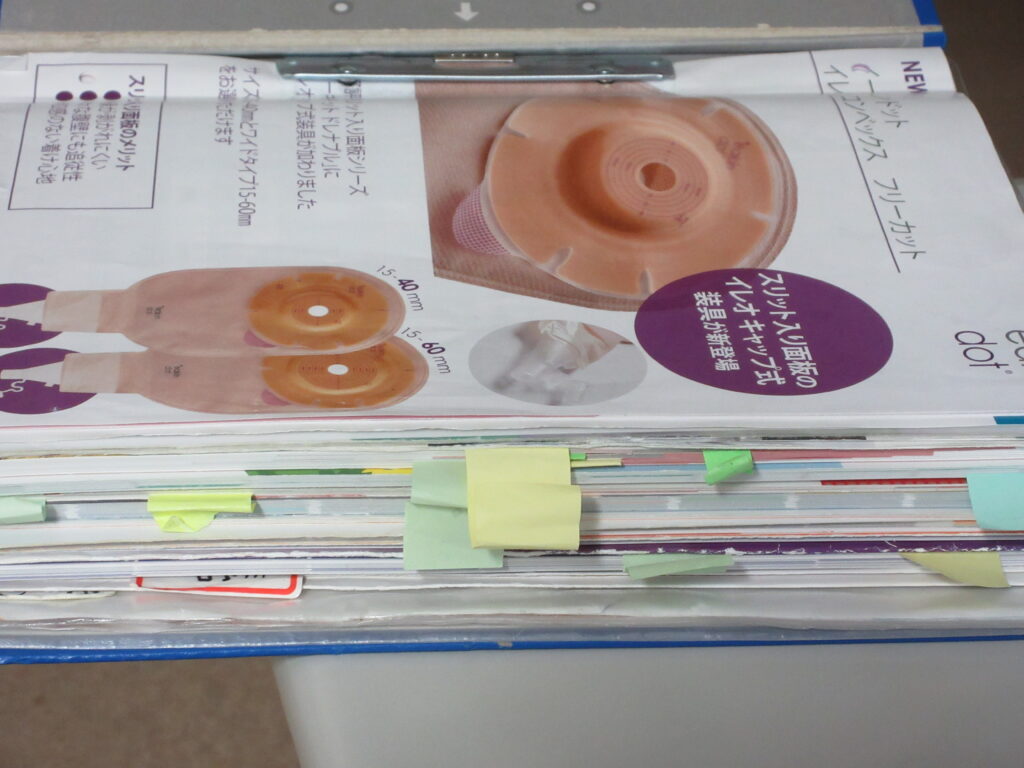 こんな分厚いファイルの中から、患者さんのストーマの状況、皮膚の状況や体型など用途に応じて数々の製品を検討し、選択していきます。ファイルの厚さはごらんの通り。重さは3.6kgもありました。