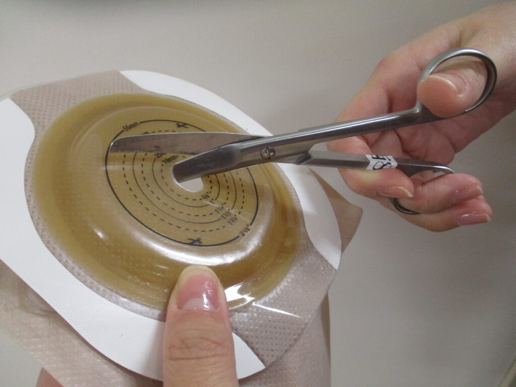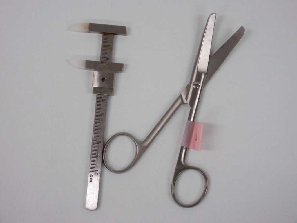 左側にあるのはノギスという物品です。ストーマのサイズを測定します。右側はストーマカット用のはさみです。カットしやすい様に先が曲がっているのが特徴です。