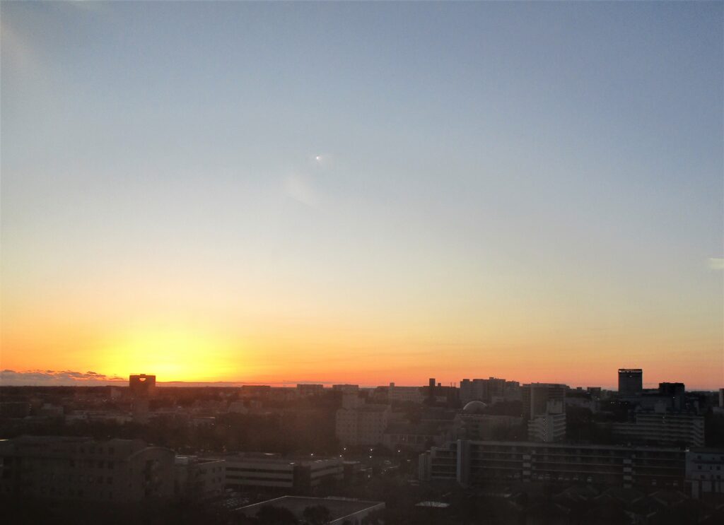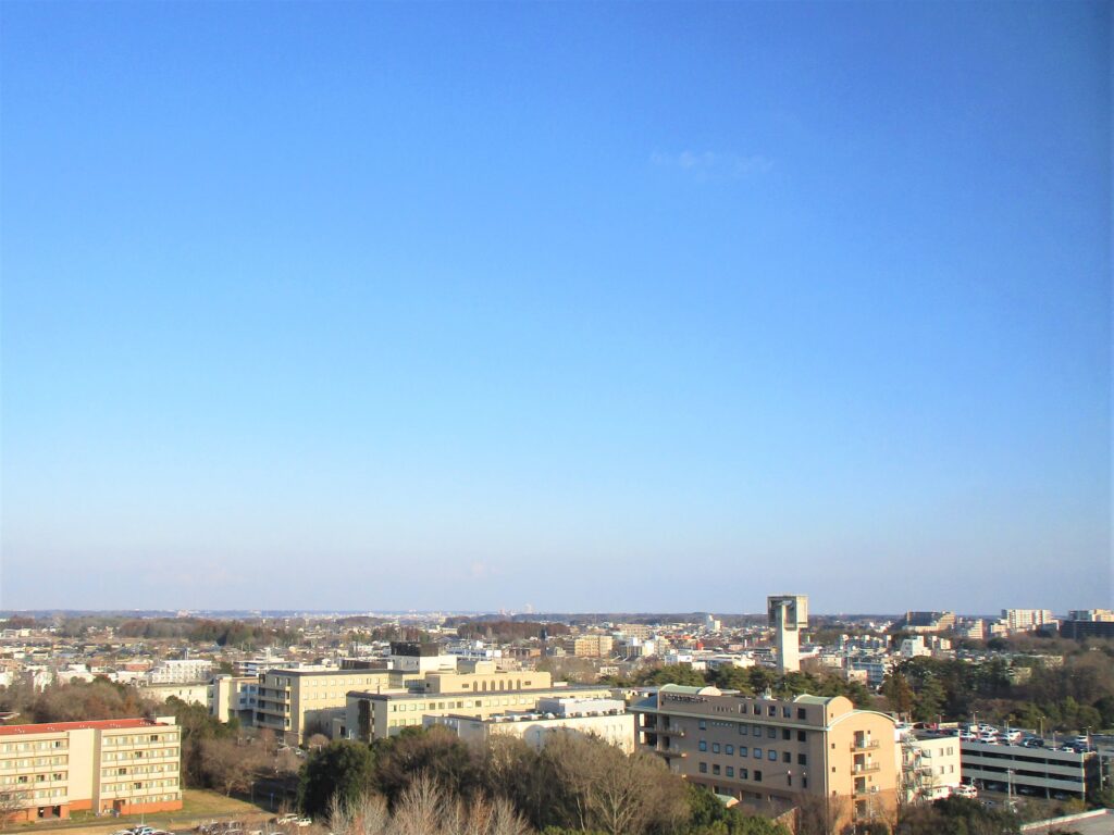 日中に病棟の窓から見た景色です。患者さんはリハビリで棟内を歩行することがあります。長椅子で休憩を挟みながらリハビリに励んでいます。その時に窓から見る景色で癒やされているそうです。特に11階から見る景色は遮る建物が少なく綺麗に見えます。