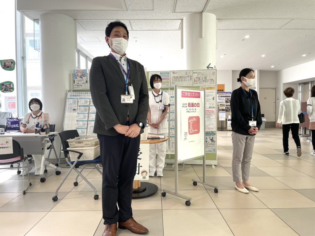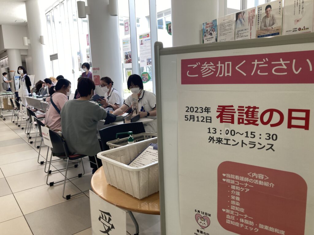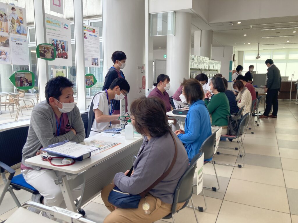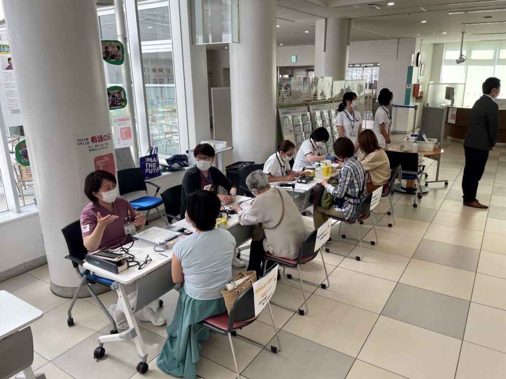 COVID-19の影響で3年ぶりの対面イベントとして開催され、緩和ケア、感染管理、摂食嚥下、認知症の認定看護師や医療連携室看護師が様々な相談を受けています。奥では、血圧などの測定も行いました。