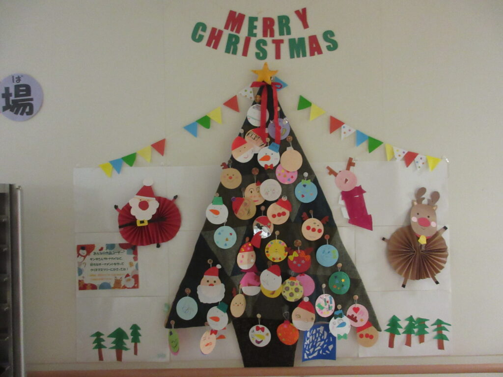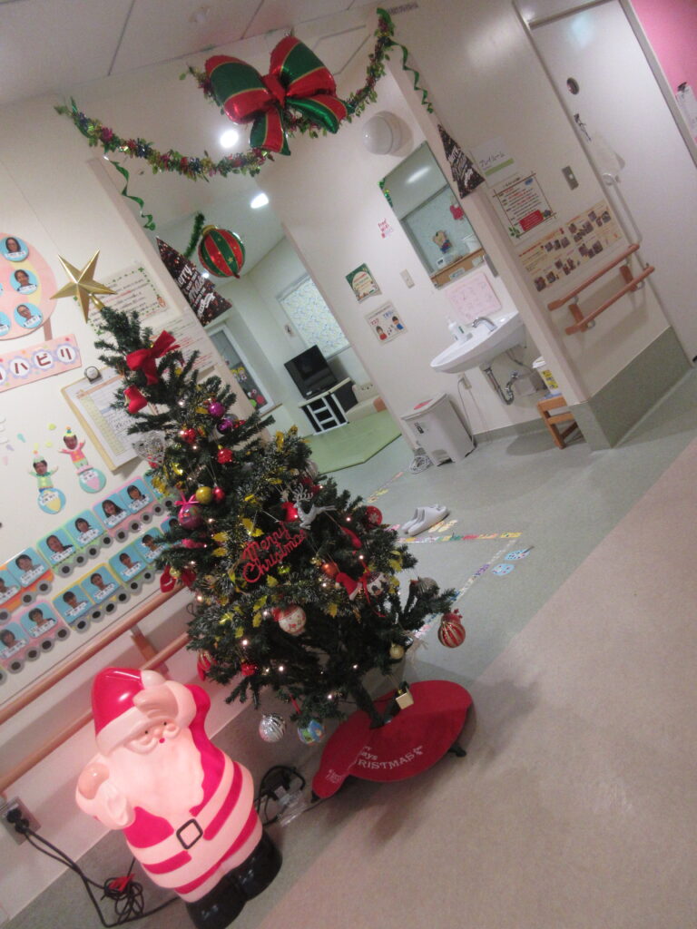 前回、夏のブログで夏祭りの様子をお届けしましたが、今回はクリスマスの病棟の様子をお届けします!現在6西病棟は、病棟中にクリスマスの装飾が施されています。写真のようなツリーをはじめ、柱や壁にはリースのような飾りもあって、賑やかで明るい雰囲気が溢れています。