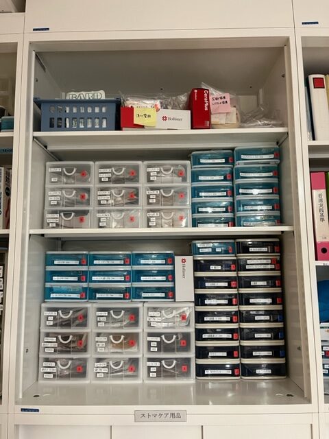 ストーマ造設術(尿路変更)を行った方に使用するウロストミーの装具もそろっており、実際にこの中からそれぞれの患者さんに合った装具を選択しています。