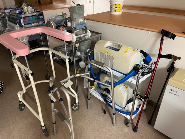 次に整形外科です。術後に使用されるアイシングシステム(創部冷却装置)やCRM(関節可動域訓練)があり、術後の患者さんのベッド上で使用します。また、PUW(ピックアップウォーカー)やU字歩行器、ロフストランド杖など様々な歩行器があり、病棟でリハビリを行う際に理学療法士の指導の下使用しています。