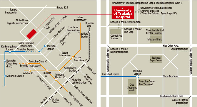 Exit the Joban Expressway at Sakura-Tsuchiura IC and head for Tsukuba. Turn right at the Sasagi intersection onto Ibaraki Prefectural Route 55 (Gakuen-Higashi Odori Ave.) toward Shimotsuma. Turn left at the Saiki intersection onto Gakuen Kita Odori Ave. Turn right at the second traffic light, then left at the next traffic light, and you will see a sign for the University of Tsukuba Hospital.